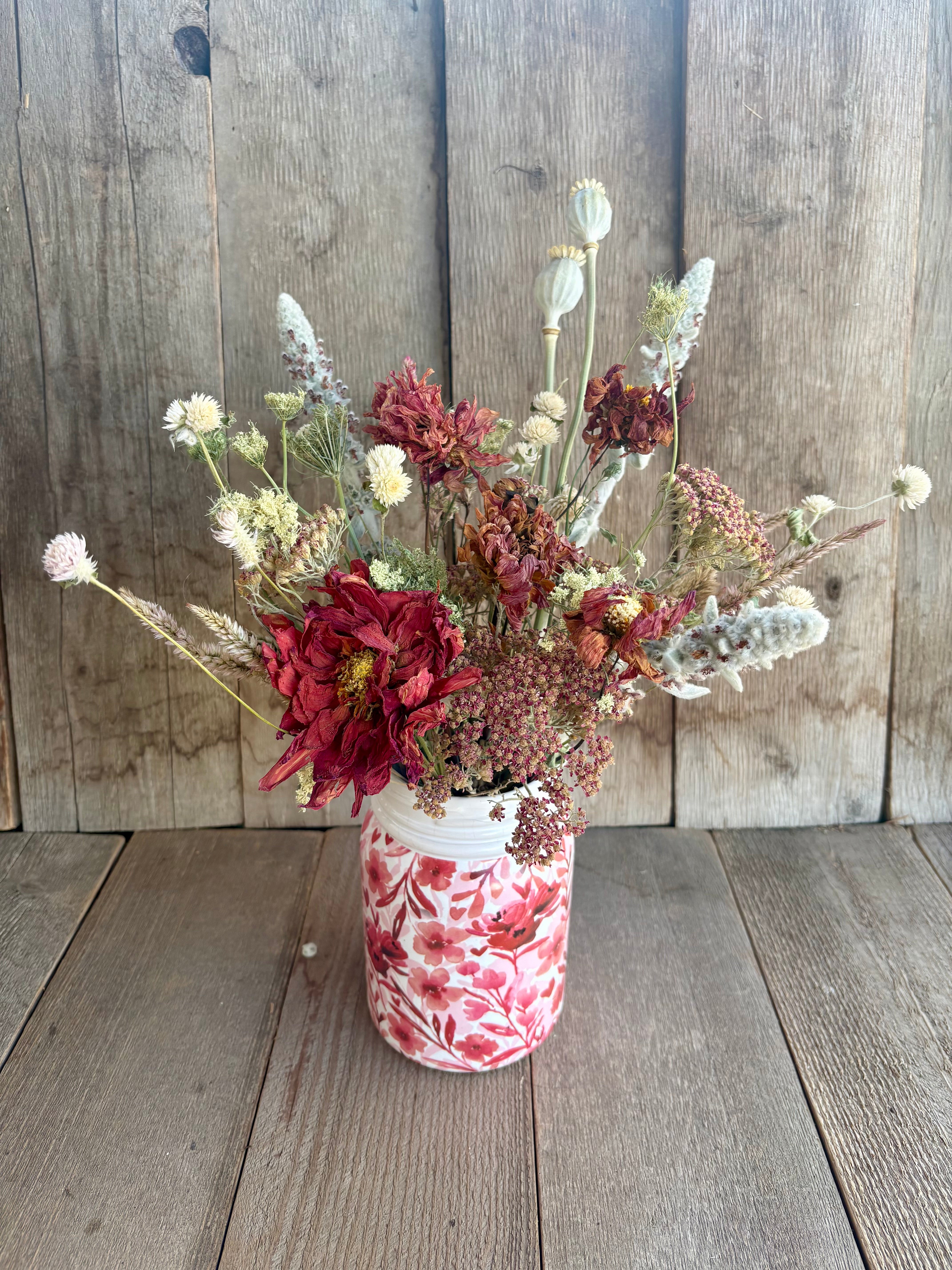 This everlasting dried flower arrangement features reds with light pinks and silvers. It includes terra cotta and supersonic dahlias, paprika yarrow, clover gomphrena, feather celosia, lamb's ear flowers, carrot flower and poppy pods. All of our dried flowers are home-grown in Arvada, Colorado or foraged from the surrounding area. We...