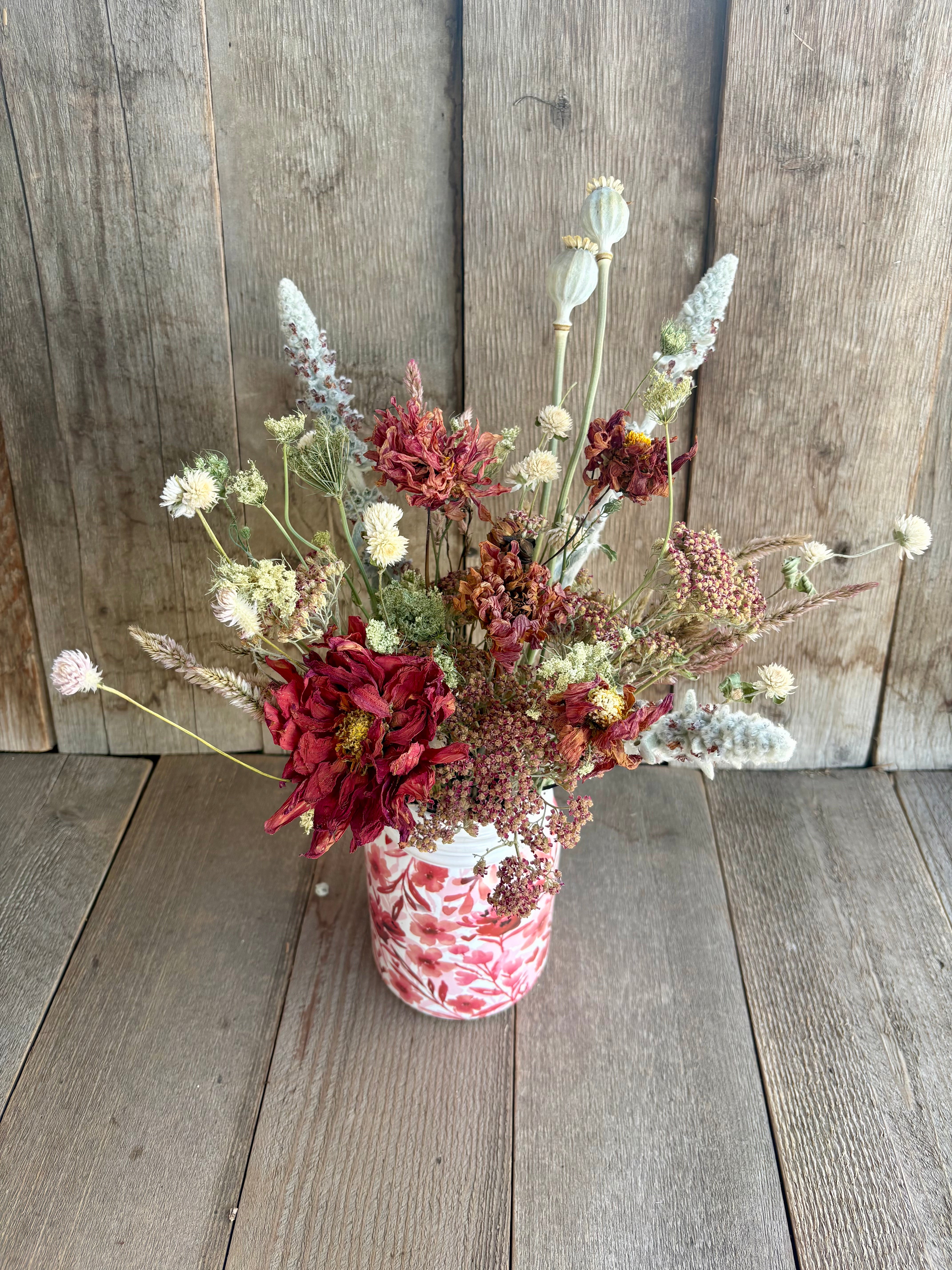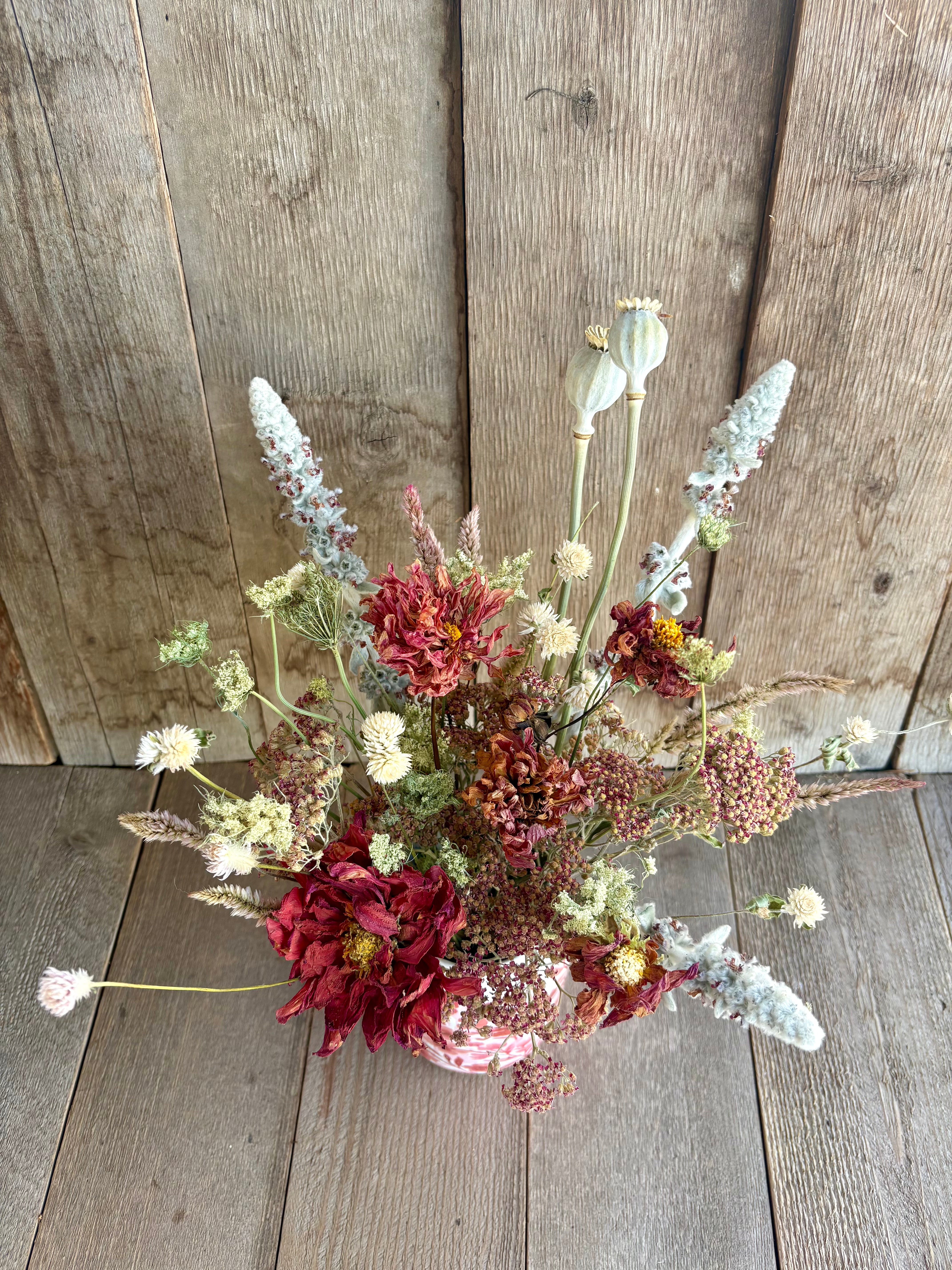This everlasting dried flower arrangement features reds with light pinks and silvers. It includes terra cotta and supersonic dahlias, paprika yarrow, clover gomphrena, feather celosia, lamb's ear flowers, carrot flower and poppy pods.