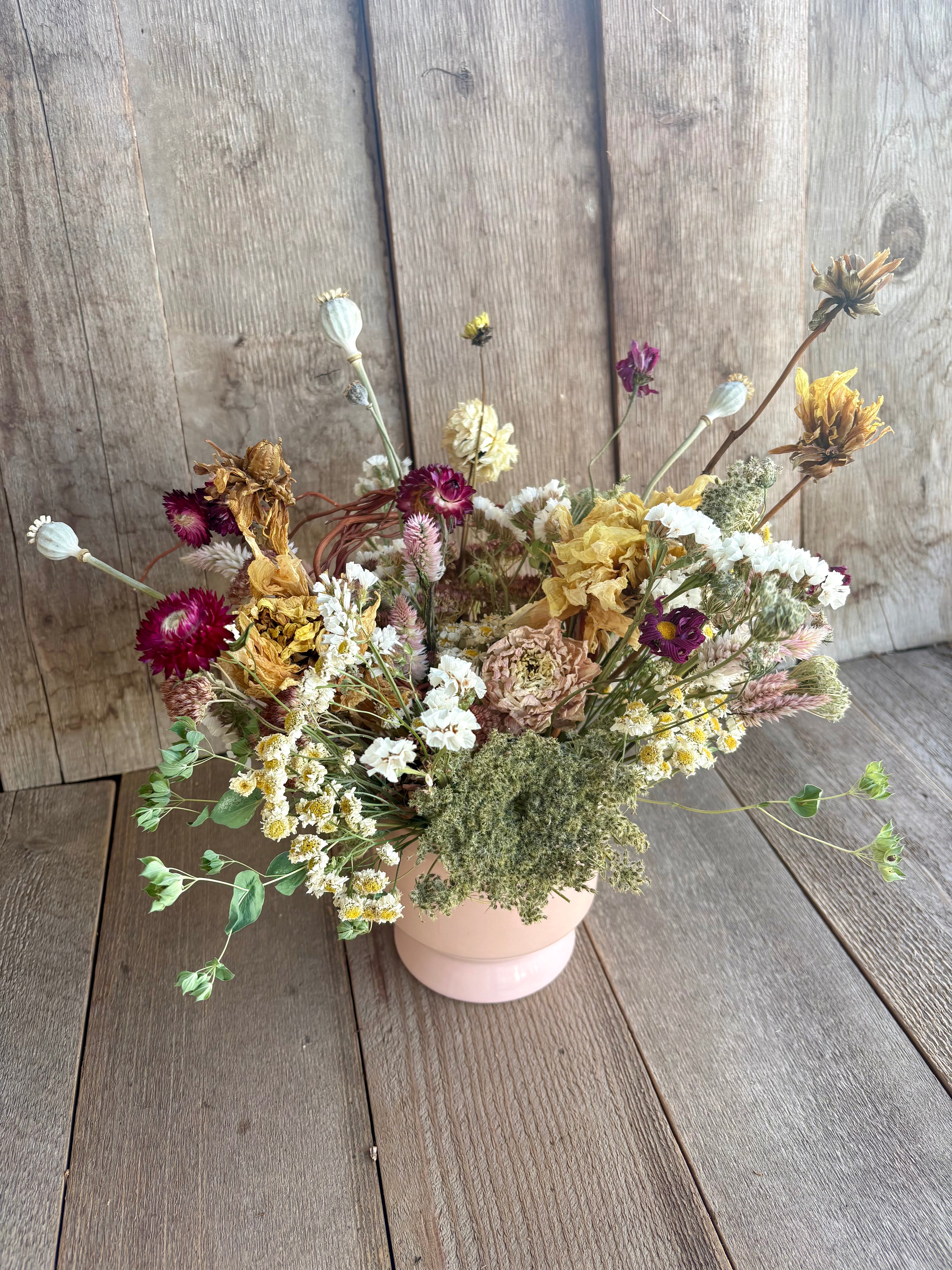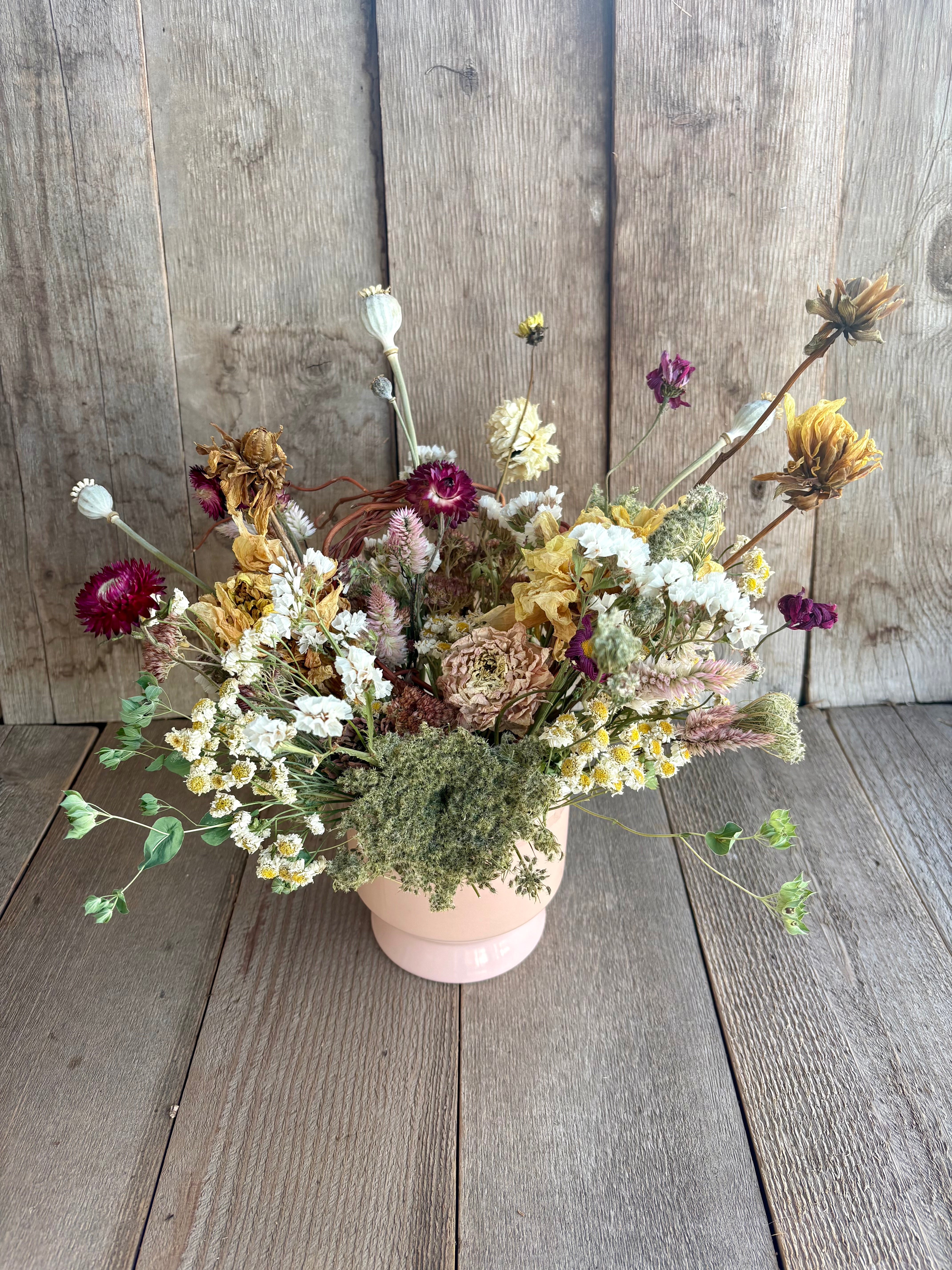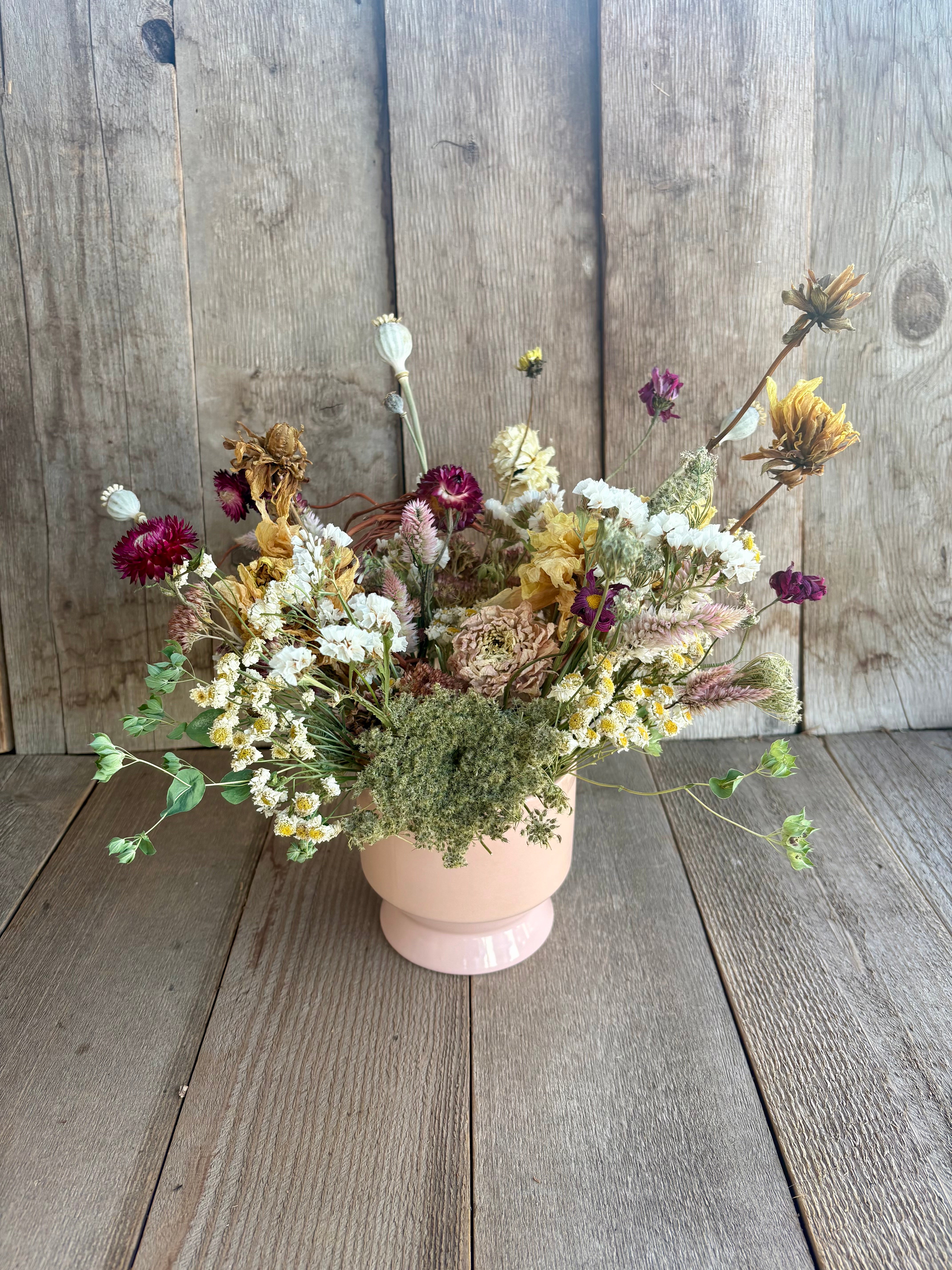 This everlasting dried flower arrangement combines sweet pastels with funky twigs in pale pink ceramic footed vase. Perfect for a centerpiece, the flowers feature include breakout and sweet natalie dahlias, deep maroon strawflower, deep maroon daisies, curly willow twigs, whtie statice, feather celosia, autumn joy sedum, feverfew, carrot flower seedhead and bupleurem.