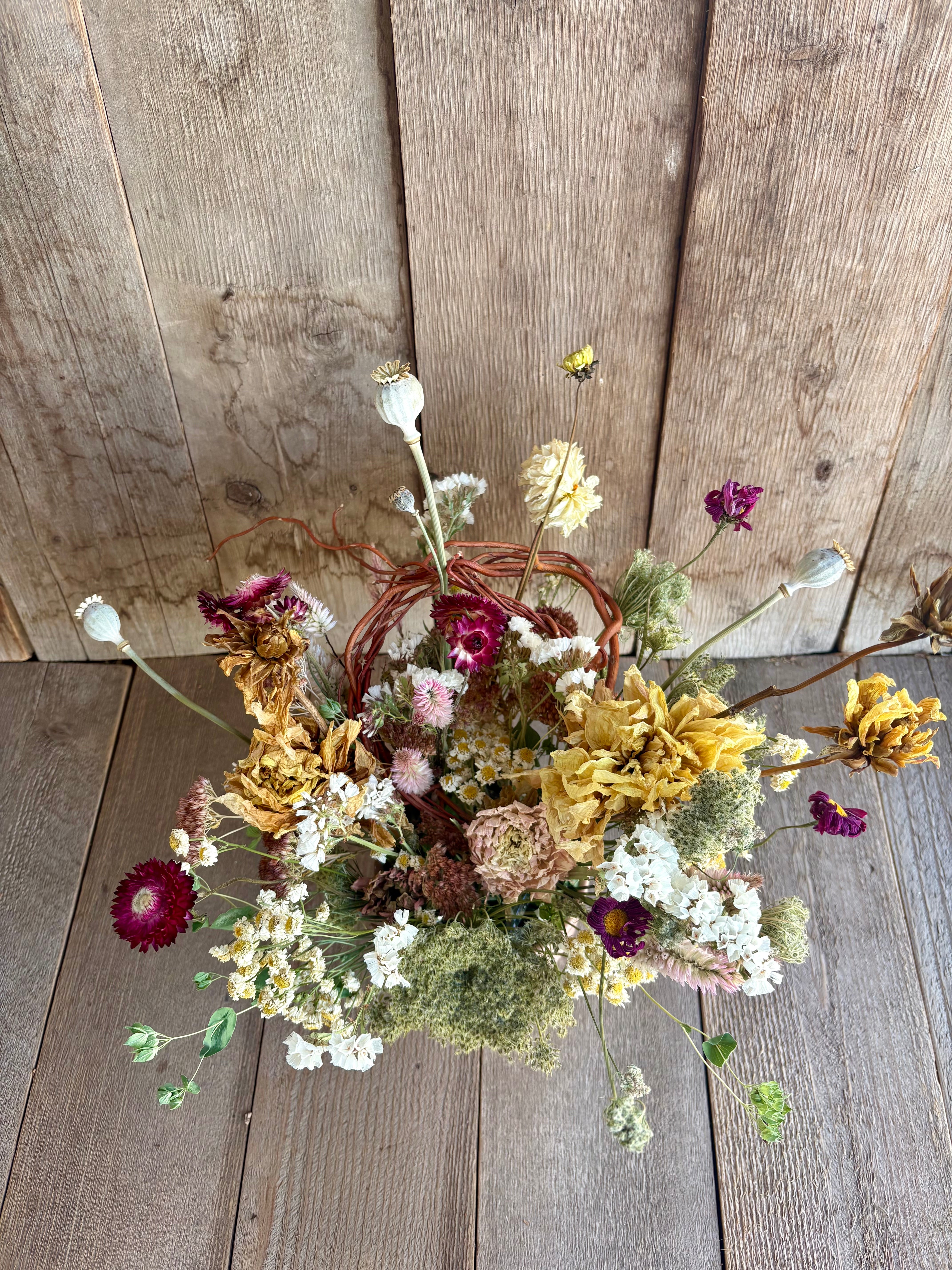 All of our dried flowers are home-grown in Arvada, Colorado or foraged from the surrounding area. We grow, harvest, process and dry flowers throughout the season in order to enjoy sustainable, locally-grown flowers all year long.