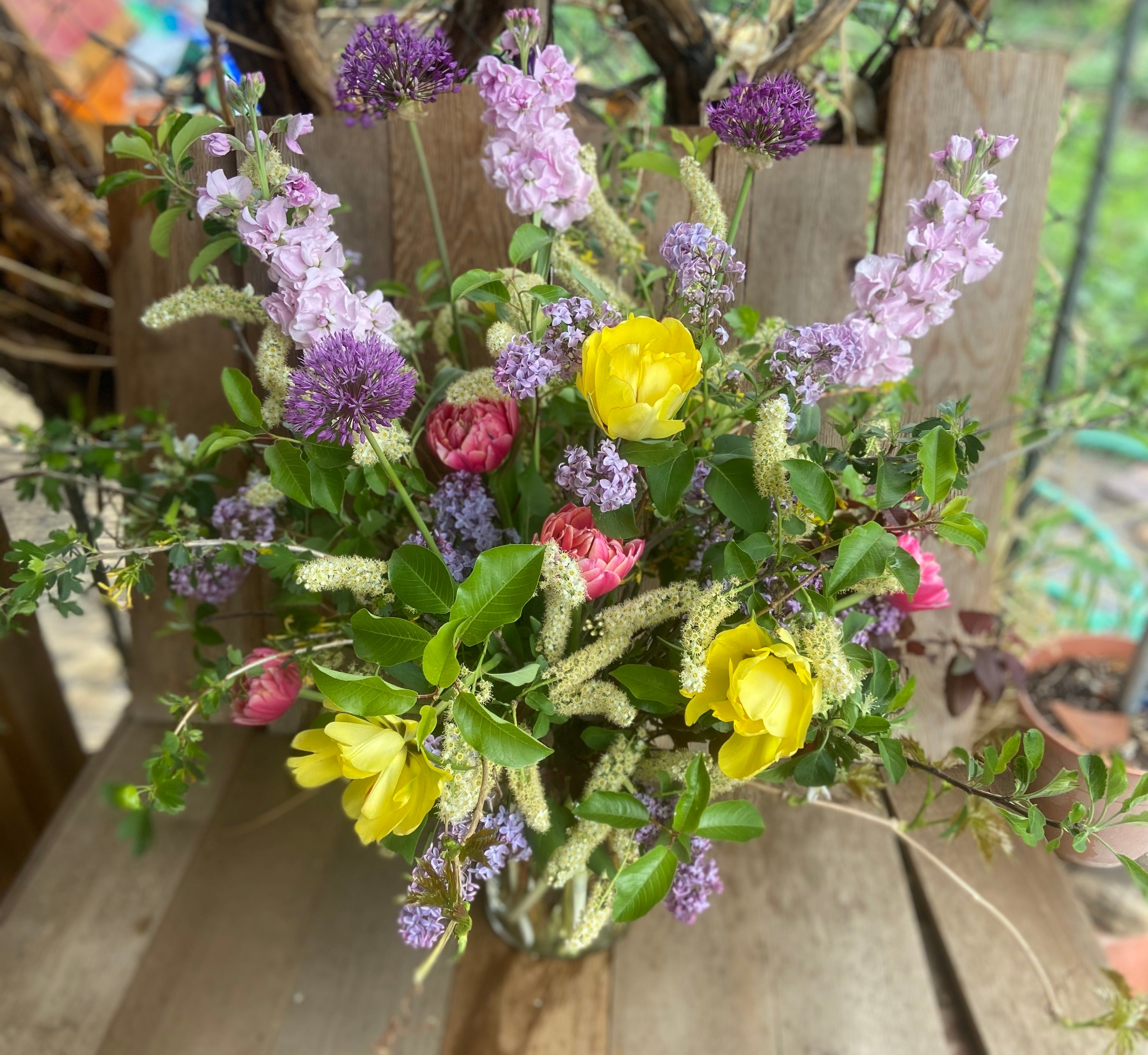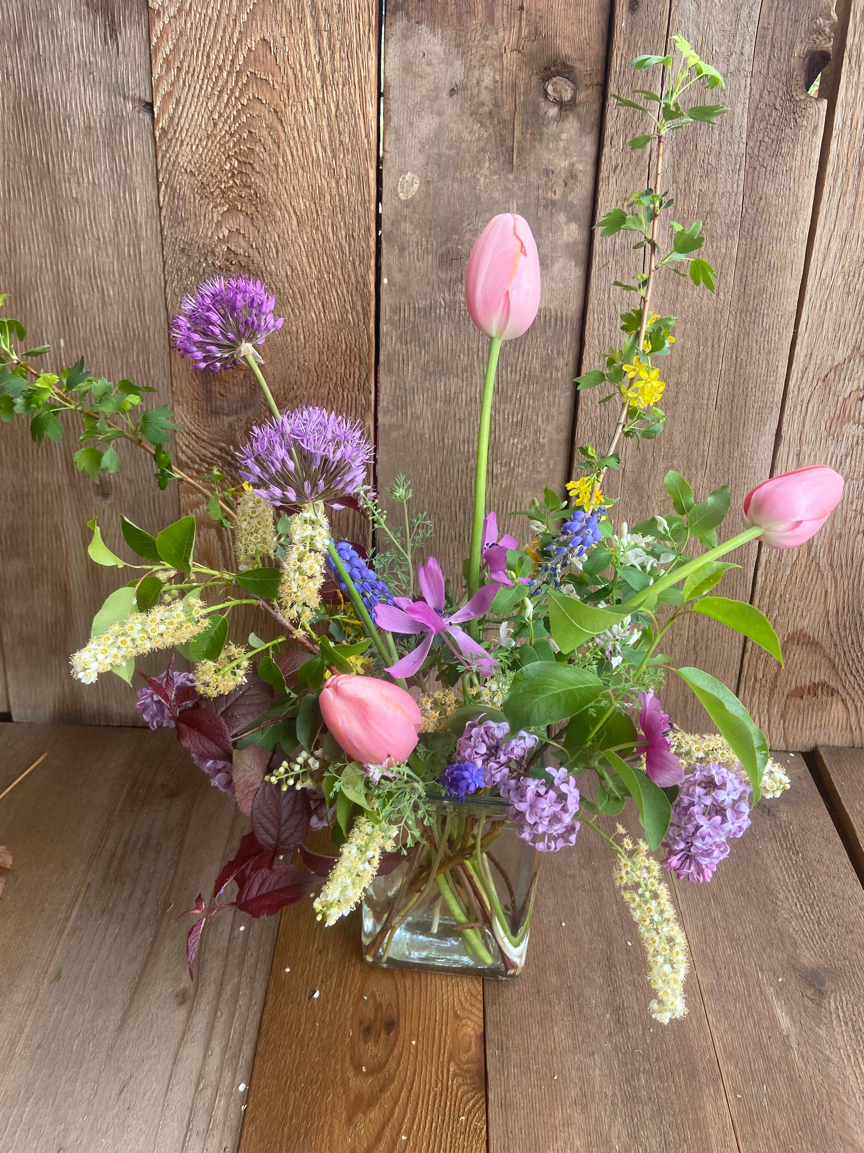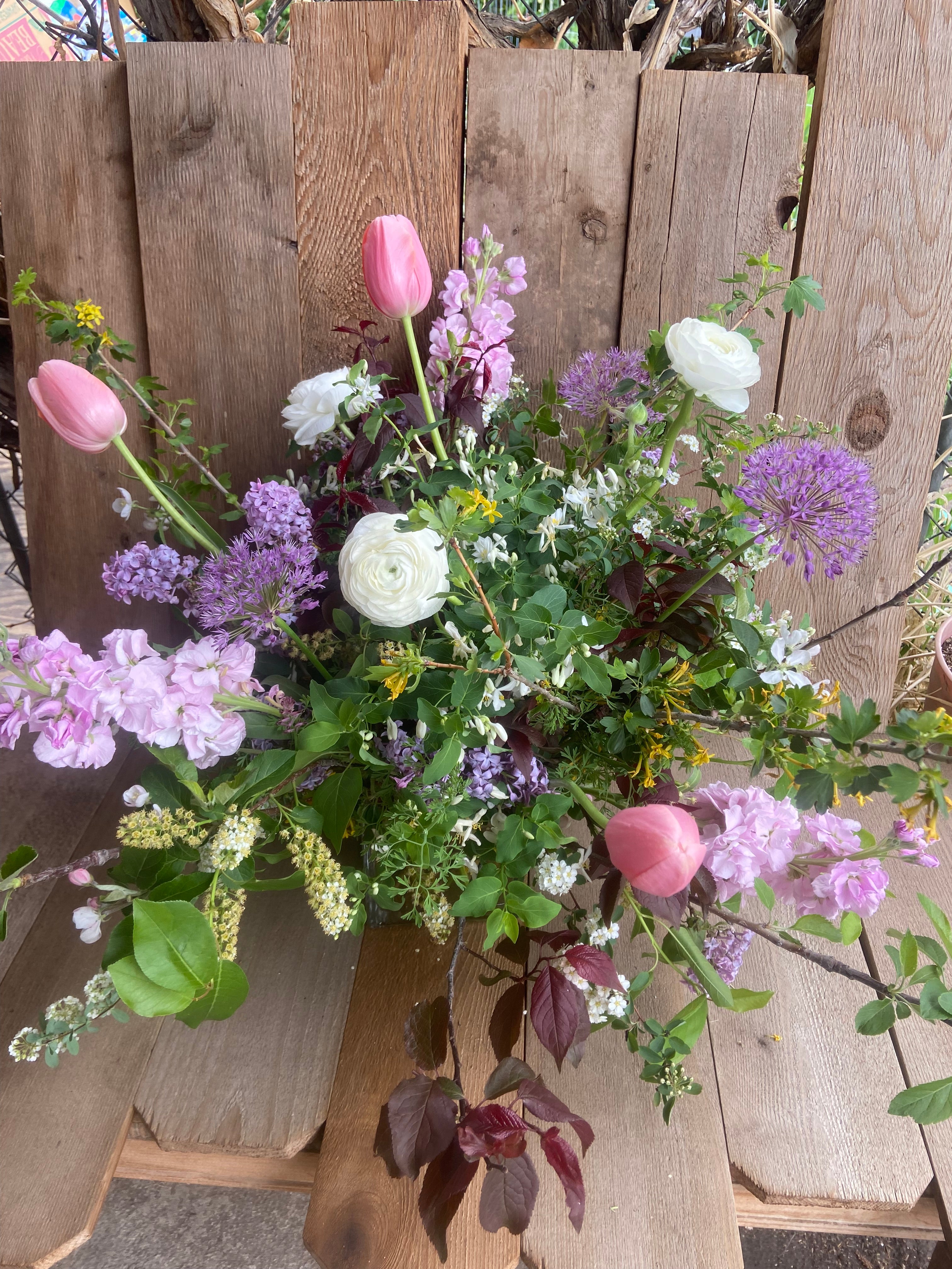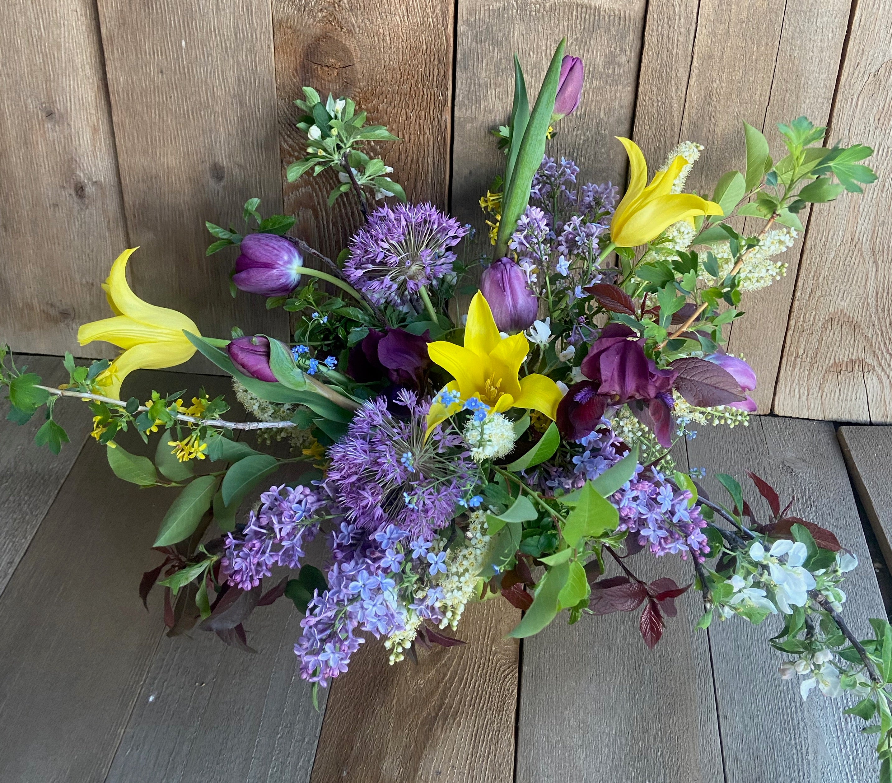 Our spring blooms includes flowering bulbs like fancy daffodils, tulips, hyacinth and alliuims; blooming branches like plum, current, choke cherry and lilac; and spring flowers like ranunculus, stock, iris, bachelor buttons and calendula.