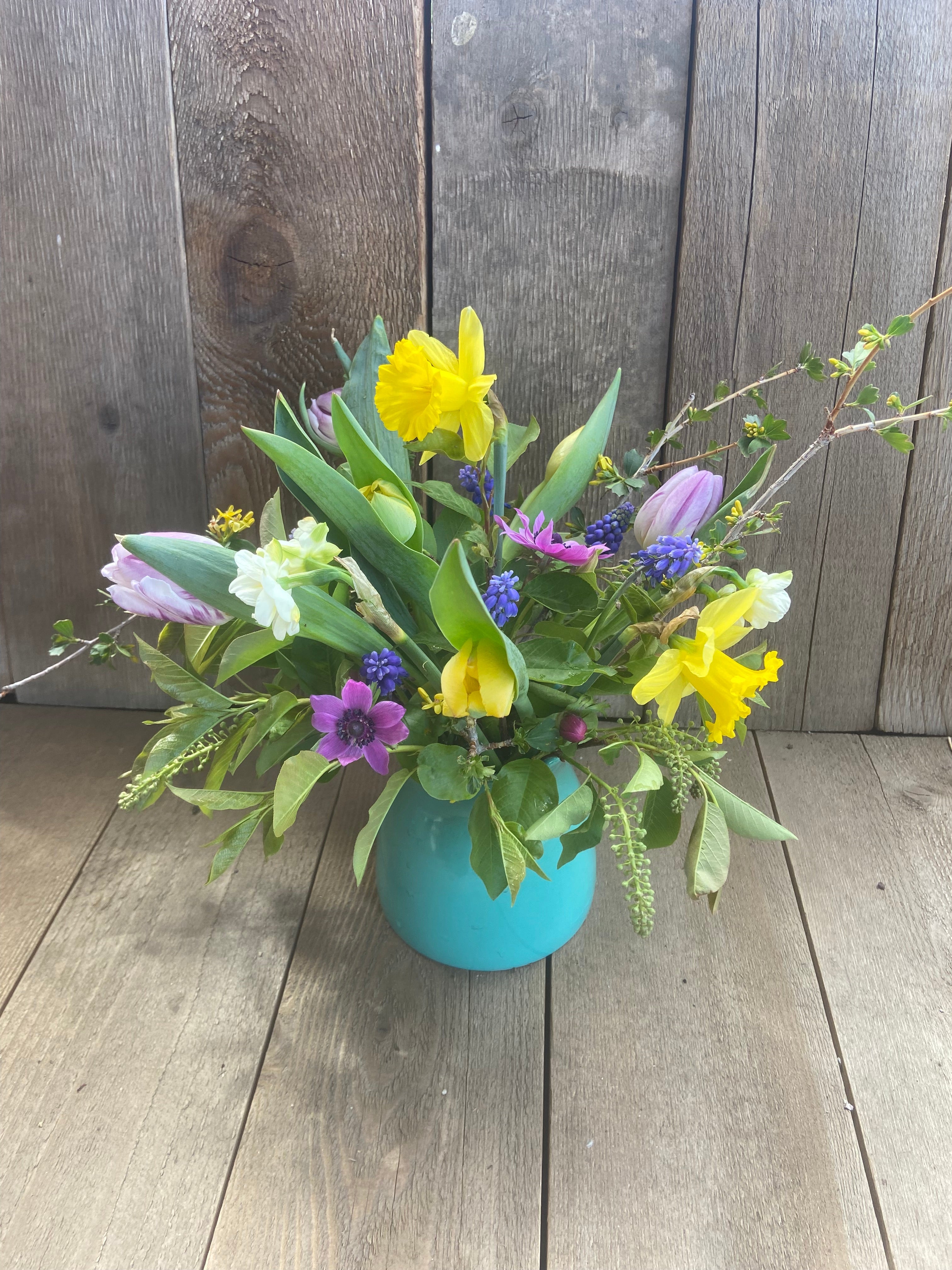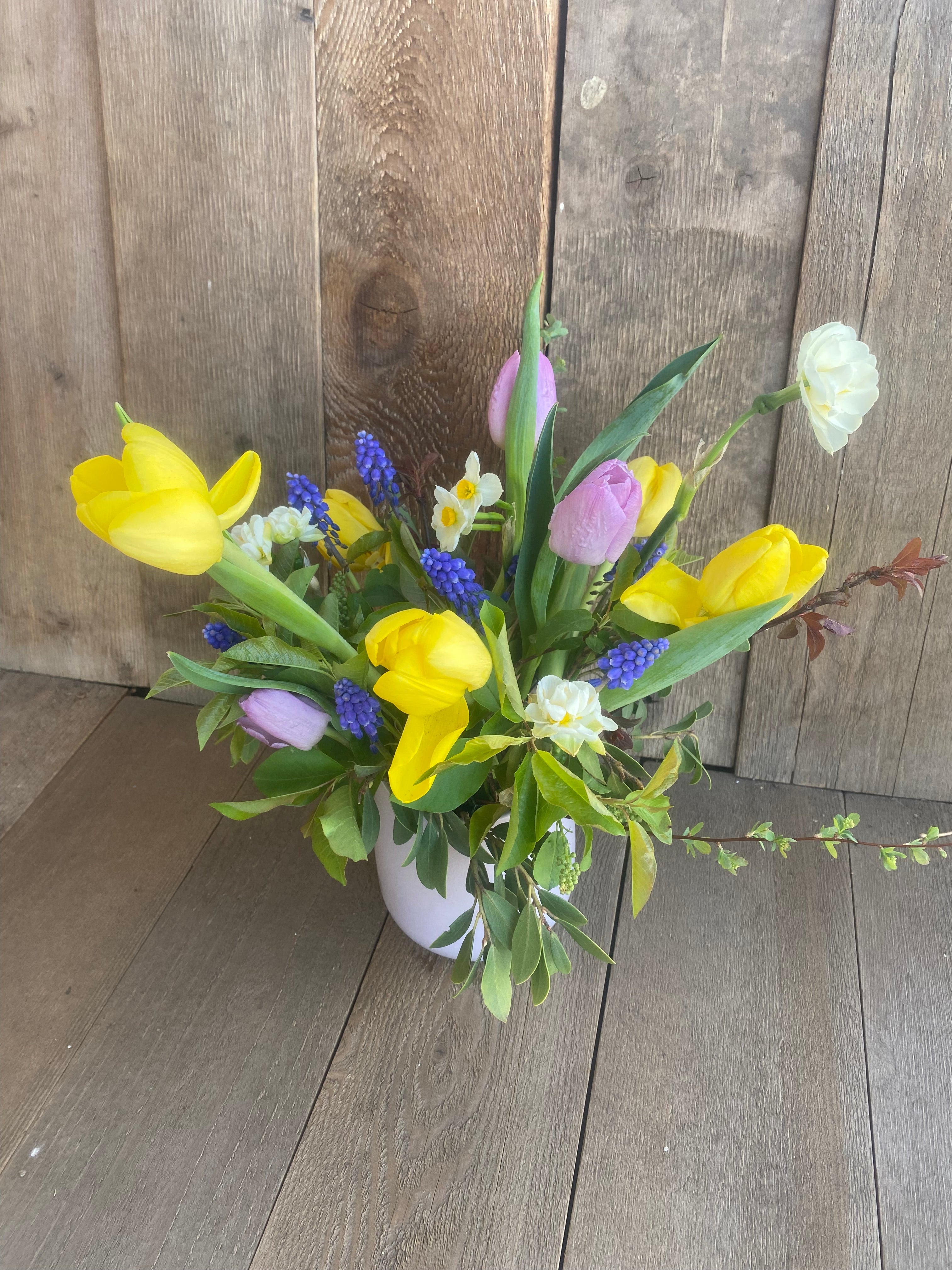 The arrangements will include tulips, daffodils, hyacinth, dutch iris, alliums, lilac, honeysuckle, stock flower, ranunculus, anemones, siberian iris, larkspur, current, chokecherry, apple blossom, columbine, salvia, bachelor buttons, german bearded iris, poppies, penstemon, lambs ear, spirea and painted daisy.
