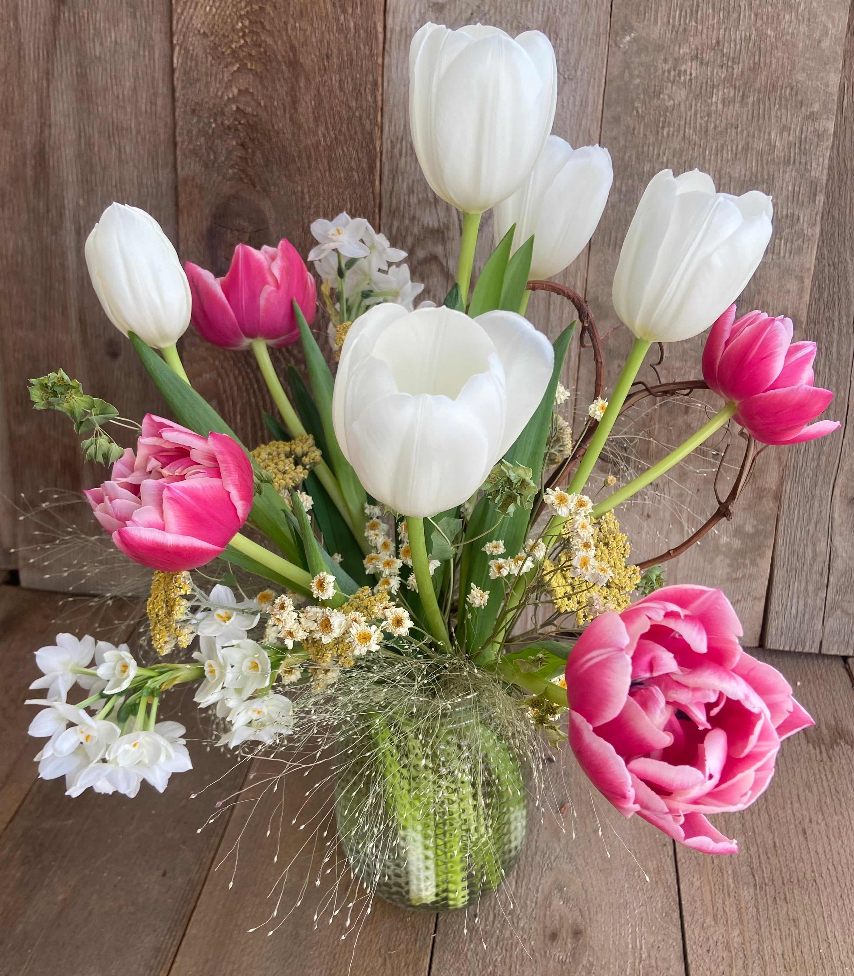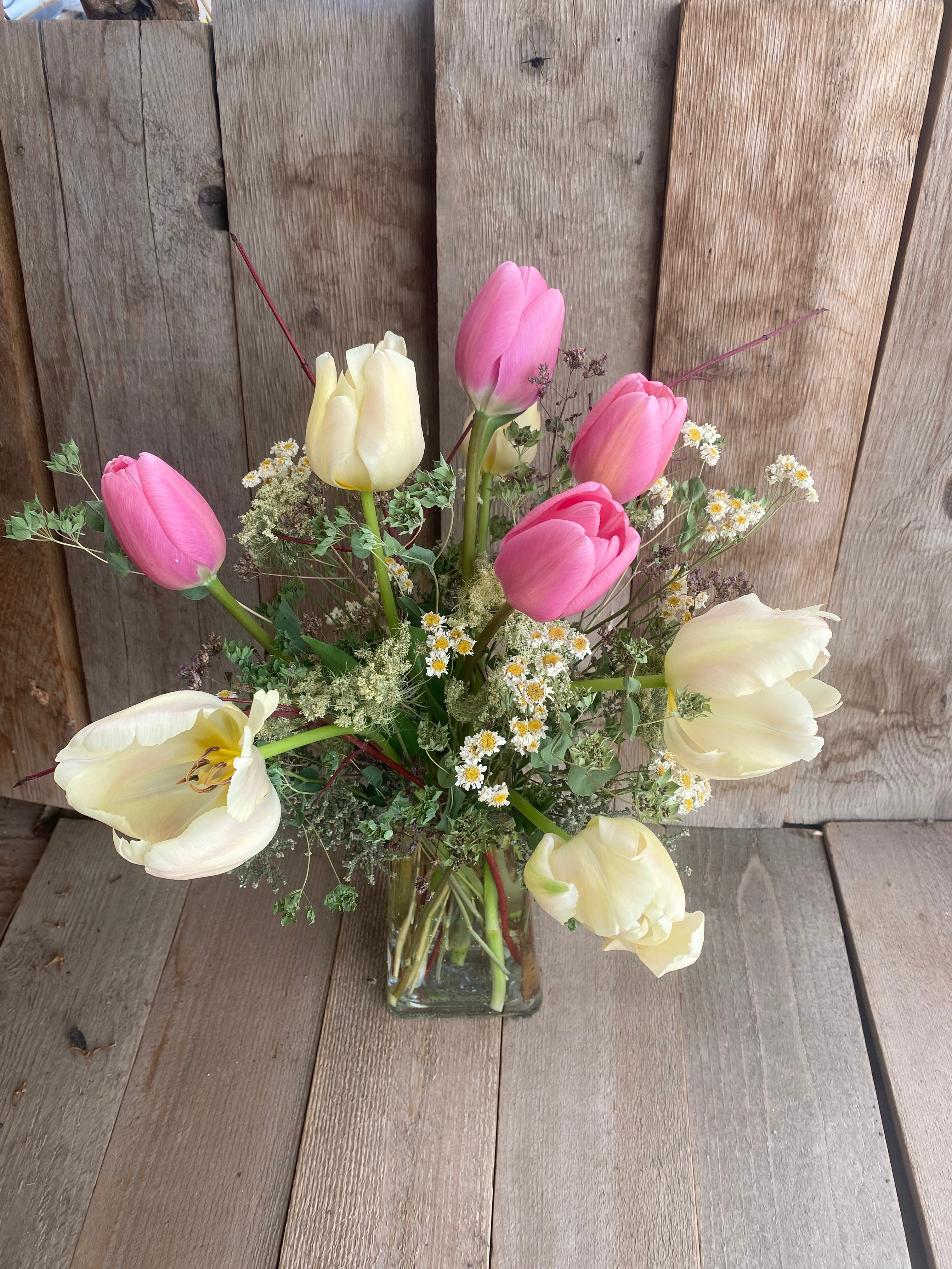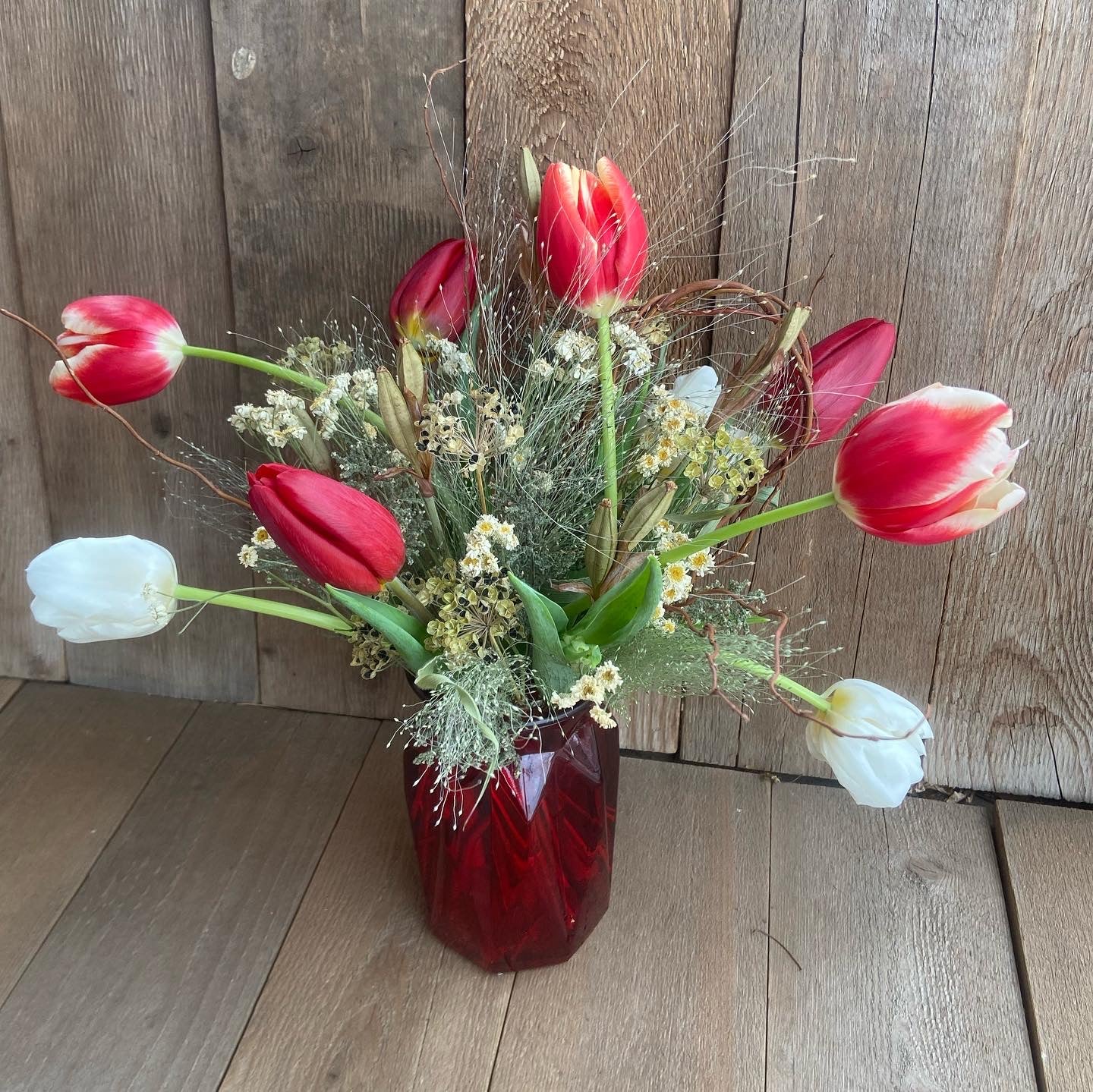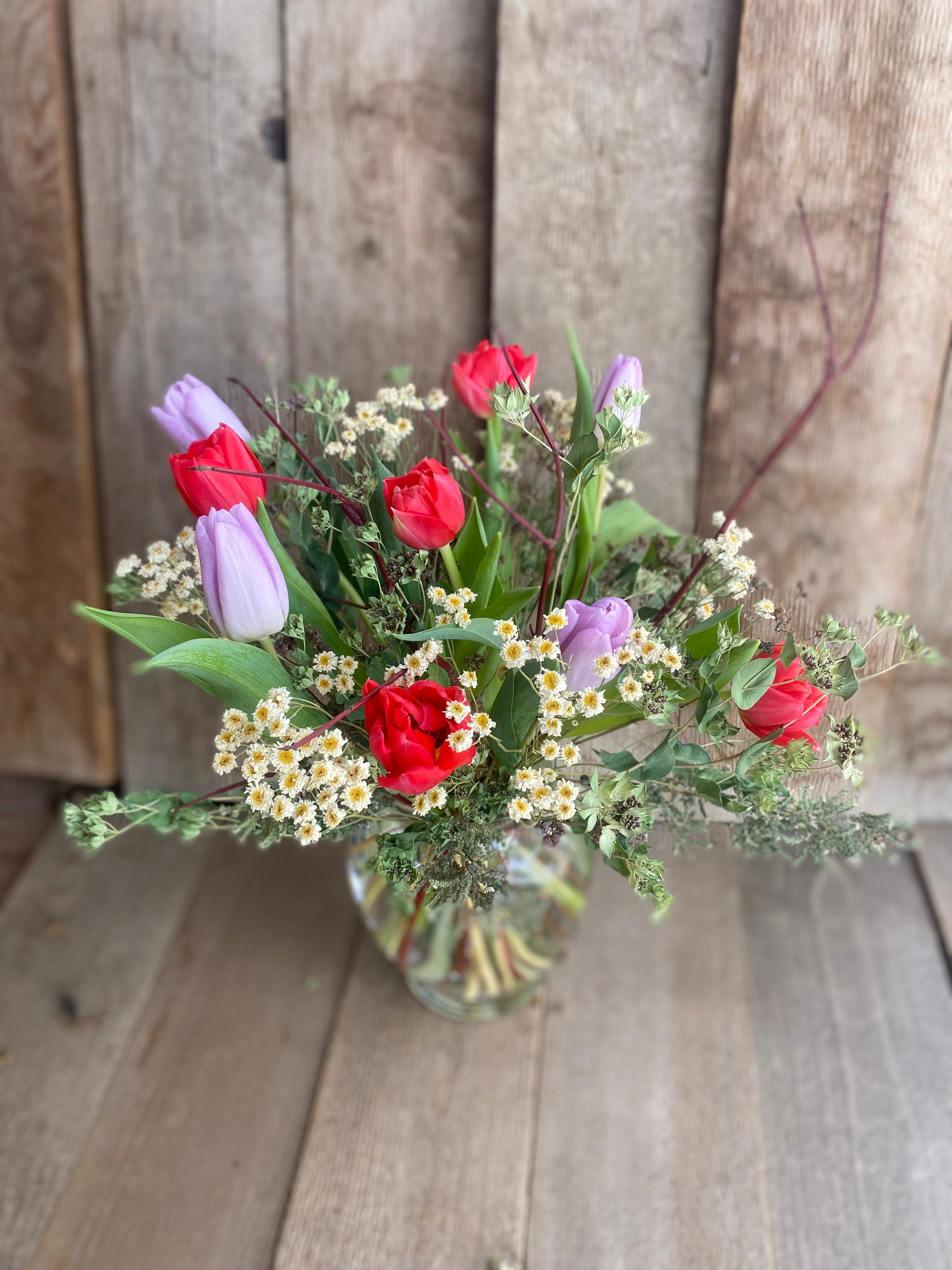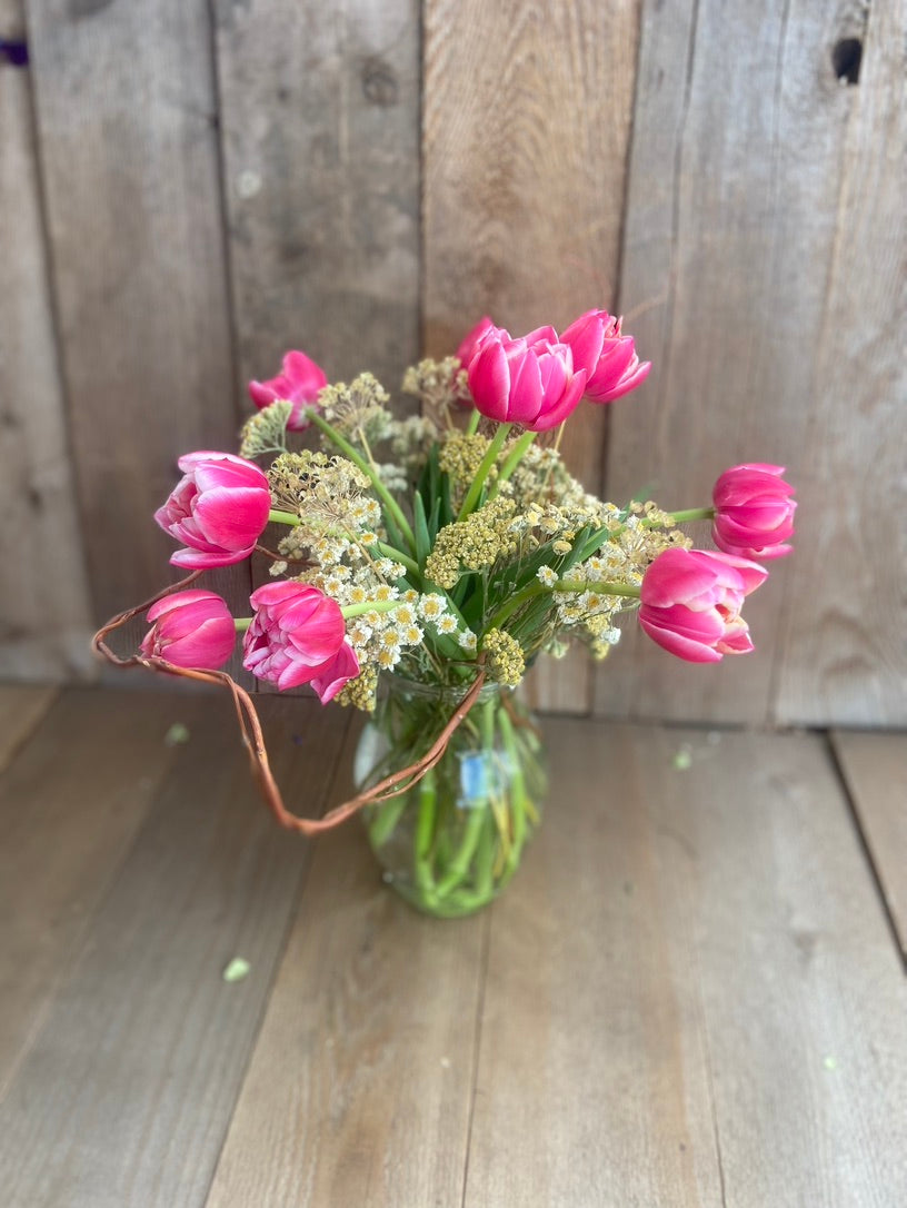 Our signature arrangement for Valentine's Day! It comes with locally-grown fresh flowers interspersed with our homegrown dried flowers, greenery, seedheads and twigs. The fresh flowers are grown in greenhouses at Steven&Sons in Arvada. Available varieties include tulips, irises and freesia. The dried compliments are grown right here at Down Home...