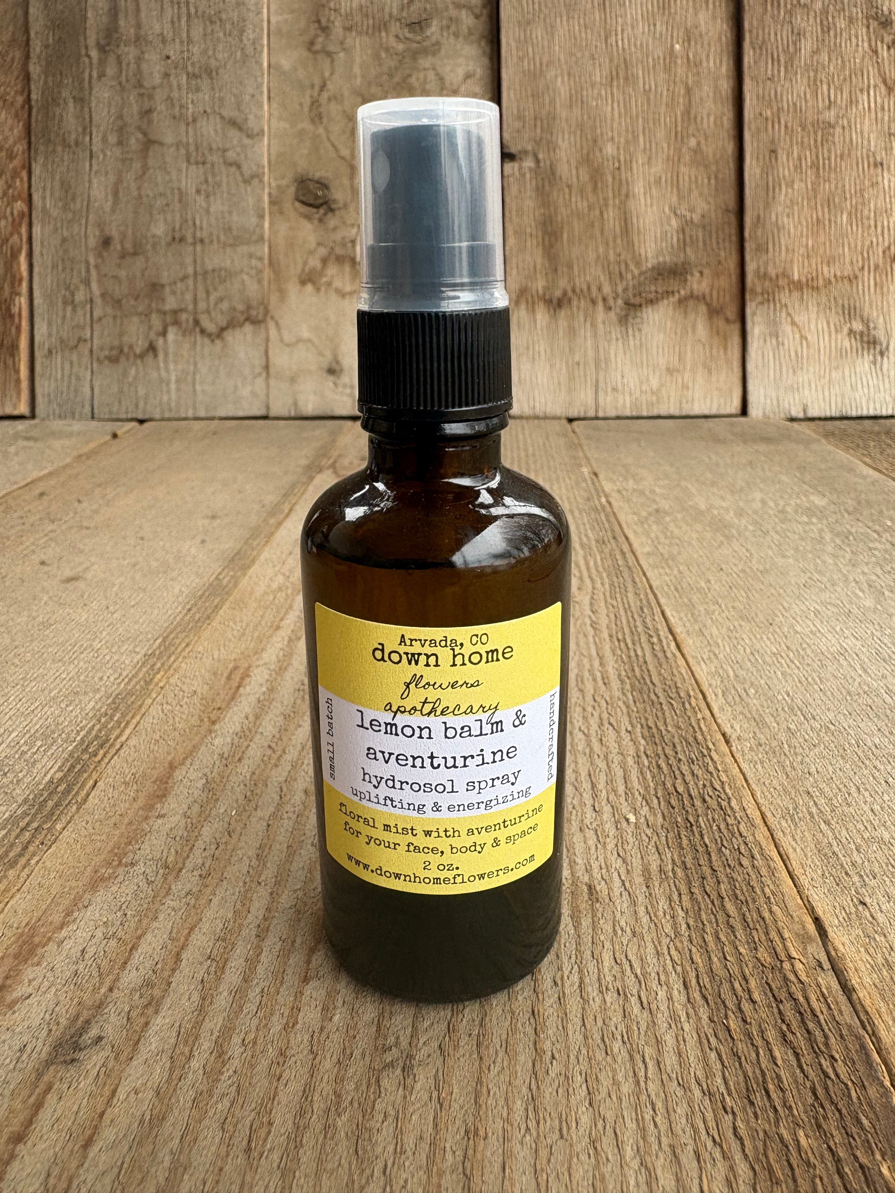 Uplifting and energizing lemon balm makes a lovely hydrosol spray to use as a facial toner, body spritz, room freshener and smudge mist. Hydrosol is just a mix of essential oil and water which is a product of distilling. We distill our homegrown lemon balm in small batches and add an aventurine crystal chip to each bottle. Aventurine is a powerhouse crystal and adds to the positive energy of this spray.